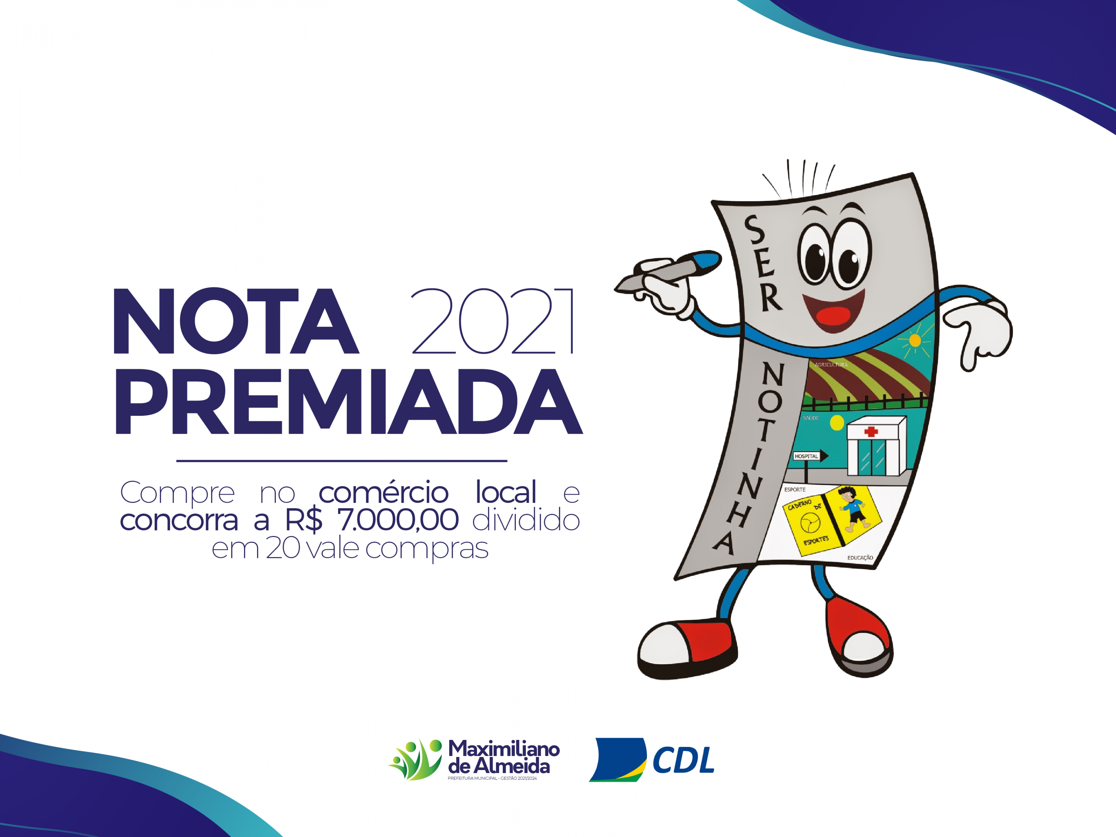 Acontece neste sábado, 26, o sorteio da Nota Premiada 2021, uma campanha da Prefeitura de Maximiliano de Almeida e CDL Acismax. Com uma premiação de R$ 7.000,00 dividida em 20 prêmios de vale compras, o objetivo da campanha é incentivar a venda no comércio local e também, aquecer a economia.