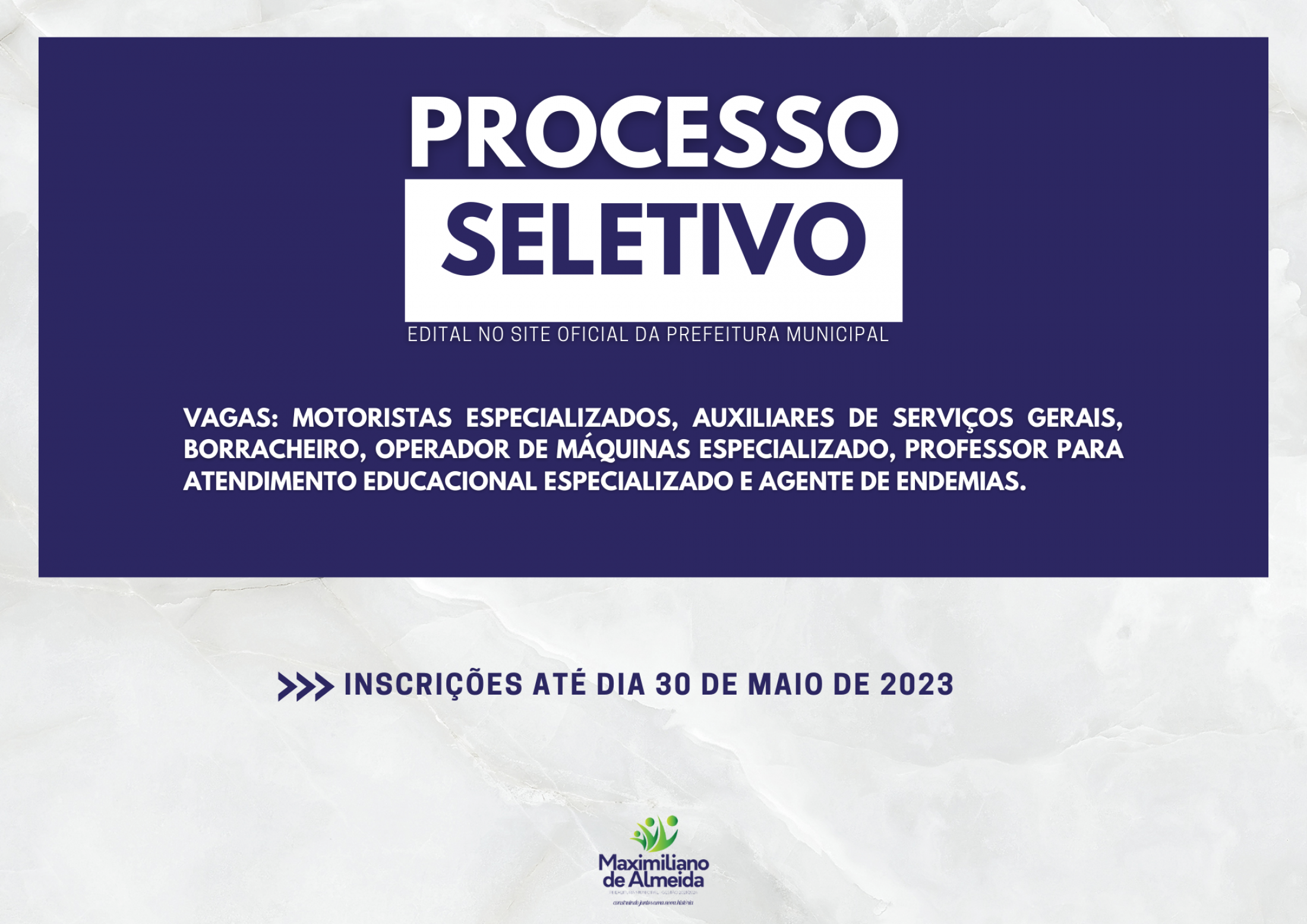 A Prefeitura Municipal de Maximiliano de Almeida informa a todos os interessados que, no período de 22 a 30 de maio de 2023, estarão abertas as inscrições para o Processo Seletivo Simplificado, visando à contratação emergencial de profissionais nas seguintes áreas: motoristas especializados, auxiliares de serviços gerais, borracheiro, operador de máquinas especializado, professor para atendimento educacional especializado e agente de endemias. As inscrições devem ser realizadas na Secretaria Municipal da Administração, durante o horário de expediente.