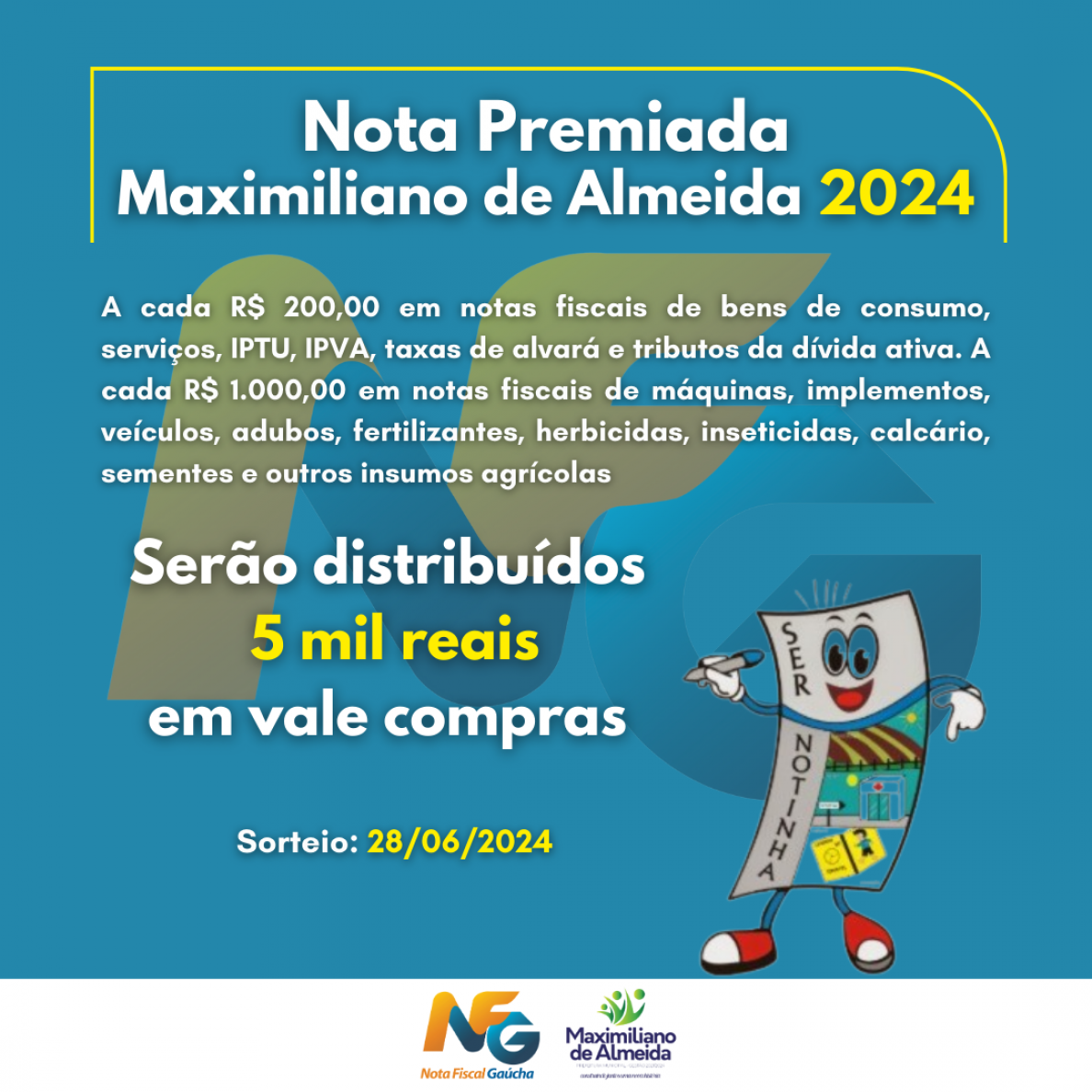 No próximo dia 28 de junho, será realizado o sorteio da Nota Premiada em Maximiliano de Almeida referente ao primeiro semestre de 2024. O evento promete distribuir R$ 5.000,00 em vales compras, incentivando a participação da população no Programa da Nota Fiscal Gaúcha.