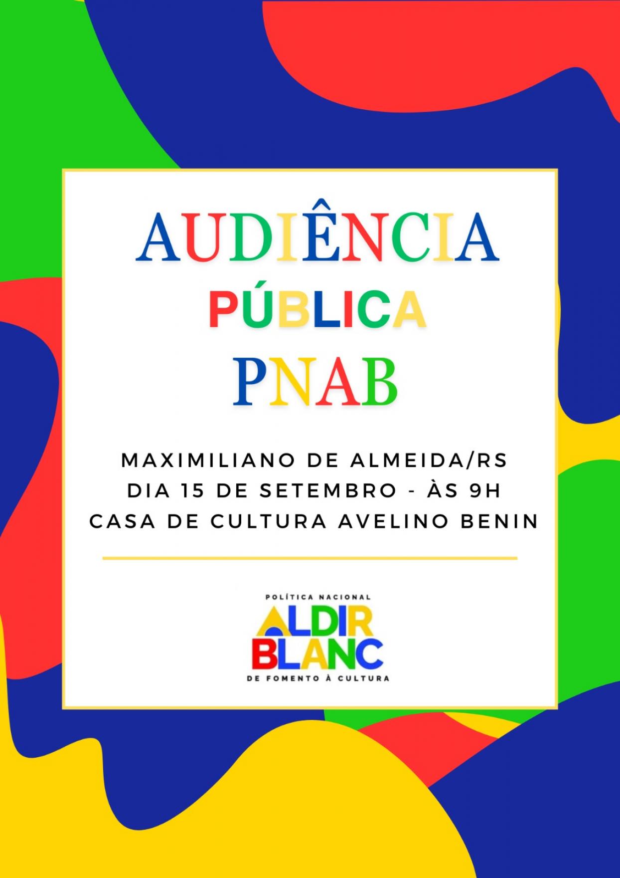 O Município de Maximiliano de Almeida convida toda a comunidade para participar da Audiência Pública da Política Nacional Aldir Blanc de Fomento à Cultura (PNAB), que será realizada no dia 15 de setembro de 2025, às 9h, na Casa de Cultura Avelino Benin.
